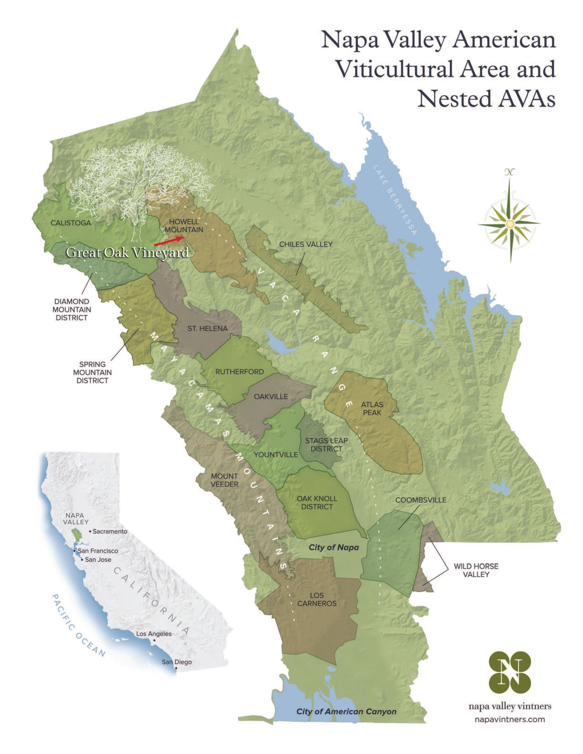 Great Oak Vineyard is located on Las Posadas Road in Angwin on Howell Mountain at an elevation of 1721 feet, above the fog line.